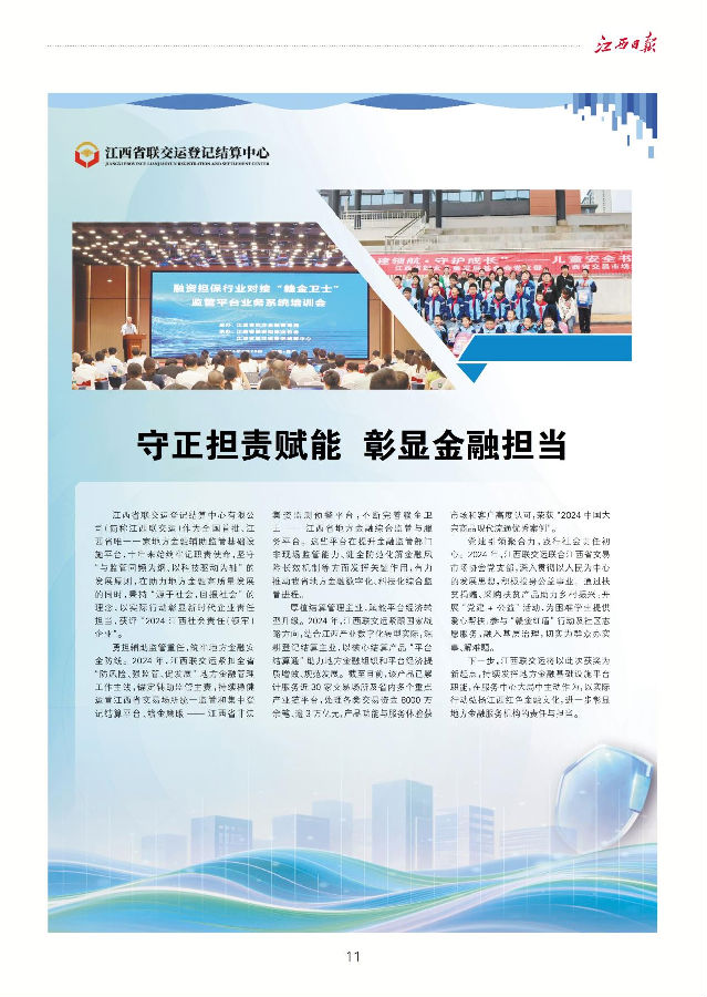 商道致遠,敢為贛先。此次榮獲殊榮,是對江西聯(lián)交運十年來始終堅持“與監(jiān)管同頻為綱、以科技驅動為軸”的發(fā)展原則,持續(xù)為全省地方金融工作高質量發(fā)展作出積極貢獻,同時始終堅持金融工作的政治性和人民性,堅持“源于社會、回報社會”的感恩理念,以實際行動和卓越成效彰顯新時代企業(yè)的責任與擔當的一次權威認可和高度肯定。殊榮的獲得,是榮譽更是使命。未來,江西聯(lián)交運將以此次榮譽的獲得作為新的起點,聚焦“走在前、勇爭先、善作為”的目標要求,繼續(xù)在圍繞中心、服務大局中更大發(fā)揮地方金融基礎設施平臺職能作用,以實際行動助力和弘揚我省紅色金融文化,彰顯江西地方金融服務機構的社會責任擔當。
