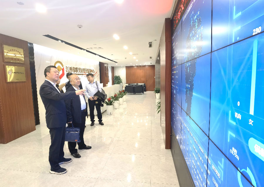 童詠雷一行首先觀摩了公司輔助監(jiān)管信息展示大屏,詳細(xì)了解了公司輔助地方金融監(jiān)管部門建設(shè)運(yùn)營的“贛金鷹眼”、“贛金衛(wèi)士”等信息化監(jiān)管平臺(tái)的管理運(yùn)行情況和創(chuàng)新做法,并給與高度肯定。